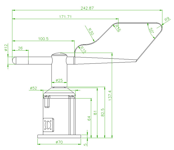 采用法蘭安裝方法,螺紋法蘭連接使風向傳感器下部管件牢牢固定在法蘭盤上,底盤Φ70mm,在Φ61mm的圓周上開四個均Φ5mm的安裝孔,使用螺栓將其緊緊固定在支架上,使整套儀器保持在最佳水平度,確保風向數據的準確性,法蘭連接使用方便,能夠承受較大的壓力。